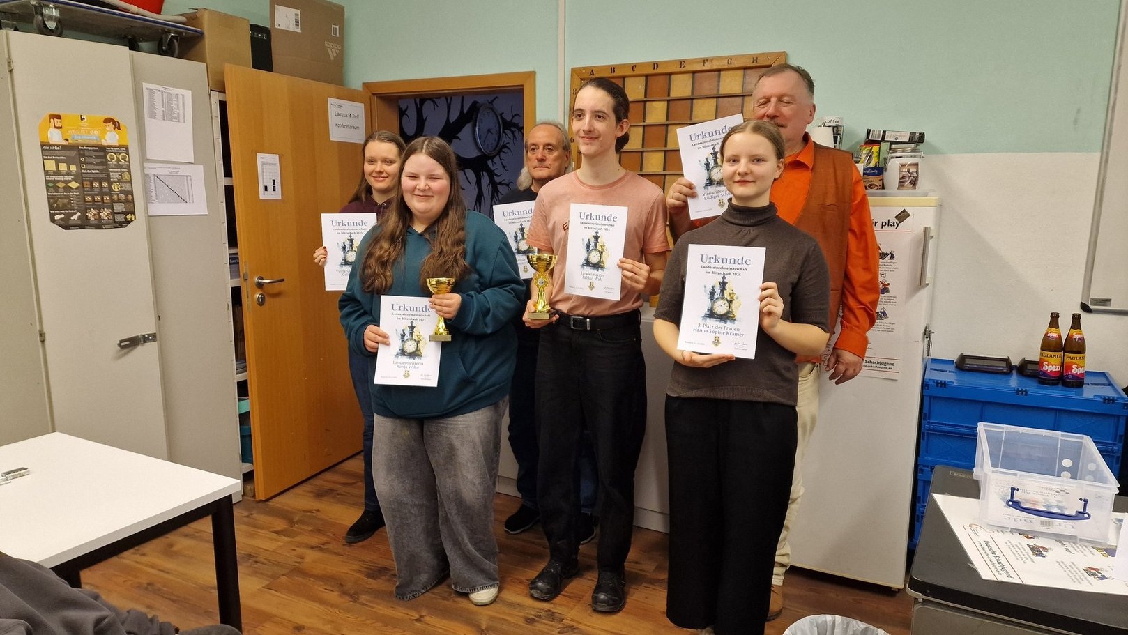 03.01.2026: Mit insgesamt 14 Teilnehmerinnen und Teilnehmern gab es in diesem Jahr ein gutes Starterfeld bei den traditionellen Schweriner Schulschachmeisterschaften. Sie wurden bereits zum 20. Mal ausgetragen. Lediglich im Grundschulbereich hätten mehr Kinder teilnehmen können, da es auch gerade ein sehr gutes Trainingsturnier gewesen ist. Dafür machten es die anwesenden Kinder hervorragend. Aliaksandr überraschte bei seinem ersten offiziellen Turnier mit dem Gesamtsieg bei den Springern, Sara gewann die altersklassenübergreifende Damenwertung und platzierte sich darüber hinaus auf dem Gesamtrang 3 der Grundschüler. Pascha erreichte bei den Läufern, die zahlenmäßig durch das Schachzentrum mit insgesamt 8 Teilnehmern dominiert wurden, den Silberrang. Markus, Konstantin und Lukas belegten die Ränge 4-6. Als einzige Teilnehmerin des Schachzentrums bei den Königen, absolvierte Hanna gute Partien gegen starke Schweriner Schachspieler. Sie belegte am Ende Rang 4 punktgleich mit Rang 3.