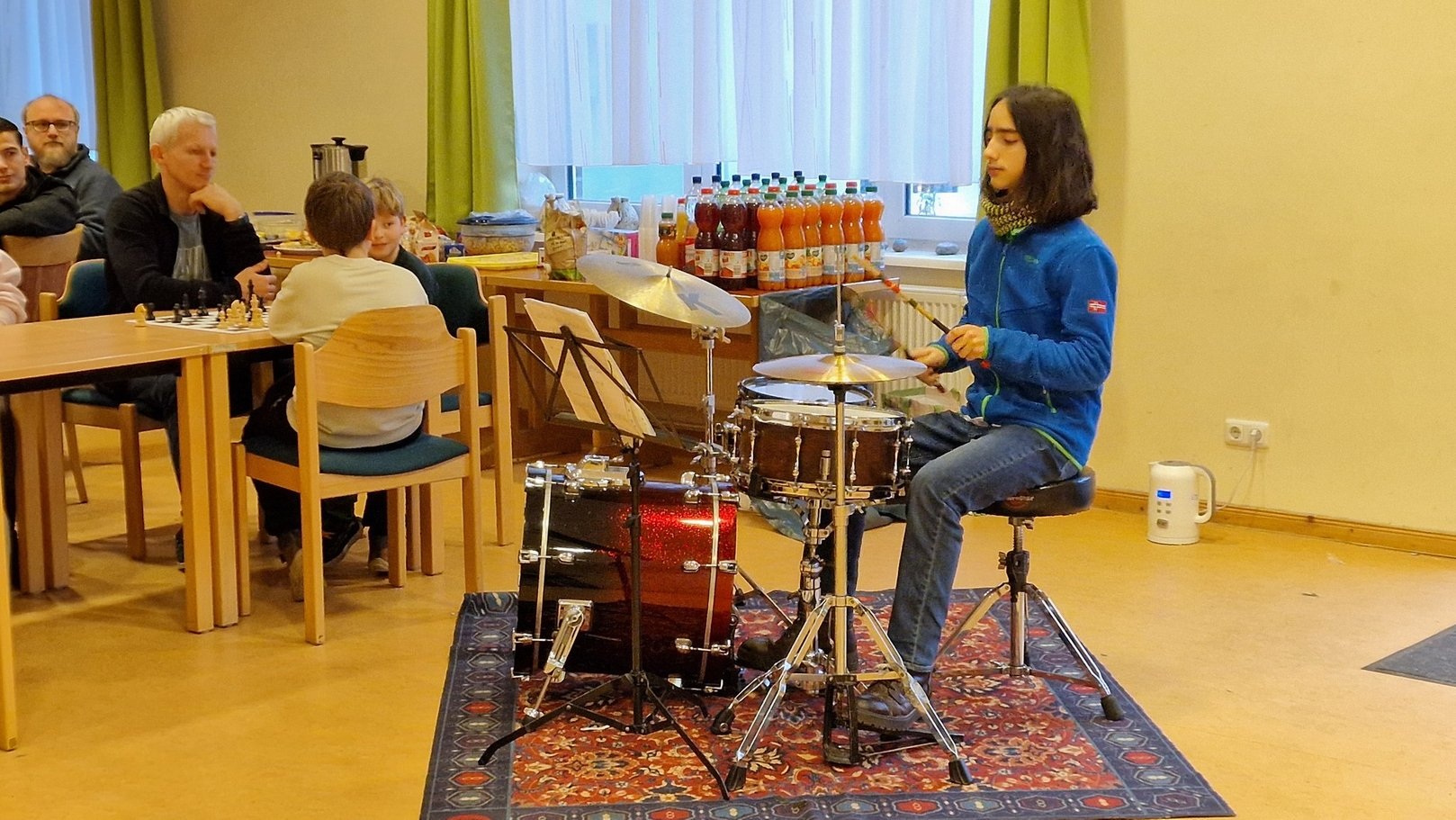 Highlight waren diesmal aber die kulturellen Beiträge, die von Olga organisiert wurden und den ersten Teil der Weihnachtsfeier, unsere Ehrungsveranstaltung, begleiteten. Eröffnet mit Weihnachtsliedern durch ein Duett von Sara und Alina mit Geige und Klarinette sowie einem Akkordeonstück von Mira war es im gesamten Saal mucksmäuschenstill und die Zuschauer waren begeistert. Genauso wie von den dann dargestellten Leistungen unserer vor allem jüngeren Schachspielerinnen und Schachspielern. In diesem Jahr ragten vor allem die Mädchen heraus und natürlich Eshwar mit seinen 3 Landesmeistertiteln, neben aber vielen, vielen anderen Kindern und Jugendlichen, die tolle Leistungen im Training und Wettkampf immer wieder an den Tag legen. Die Familie Martinez brachte sodann extra ihr Schlagzeug mit und Gabriel gab hierbei auch ein Stück aus seinem Repertoire zum Besten. Anschließend verzauberte Dimana mit einem südamerikanischen Salon-Tango auf der Gitarre und vor allem auswendig und ohne Noten gespielt. Den Schluss bildete sodann Sara mit einem hervorragend vorgetragenen Geigensolo.
