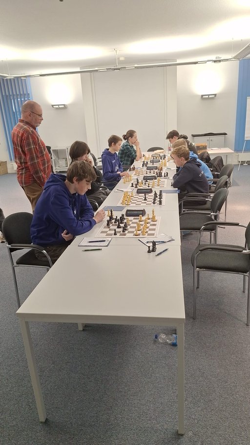13.12.2025: Nach der Auftaktniederlage ging es zum ersten Auswärtsspiel in der Jugendbundesliga Ost nach Nauen. Fast in Bestbesetzung wollte man gegen einen der schwächeren Teilnehmer auch den ersten Sieg in der Jugendbundesliga holen. Dies gelang auch eindrucksvoll. Fabian, Enrico und Maximilian gewannen an den ersten drei Brettern, Kim spielte an Brett vier remis. I-Tüpfelchen war dann der Sieg von Julian Tank an Brett 6, sodass es am Ende 4,5: 1,5 stand. Der Transport erfolgte durch einen eigens organisierten Bus, sodass sowohl die Stimmung auf der Hin- und noch mehr auf der Rückfahrt blendend waren.